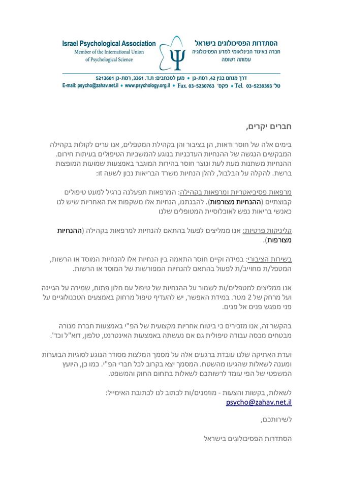 לחצו כאן בכדי לקרוא מסמך וועדת האתיקה של הסתדרות הפסיכולוגים בישראל העוסק בקווים מנחים לעבודת הפסיכולוג בזמן מגיפת הקורונה